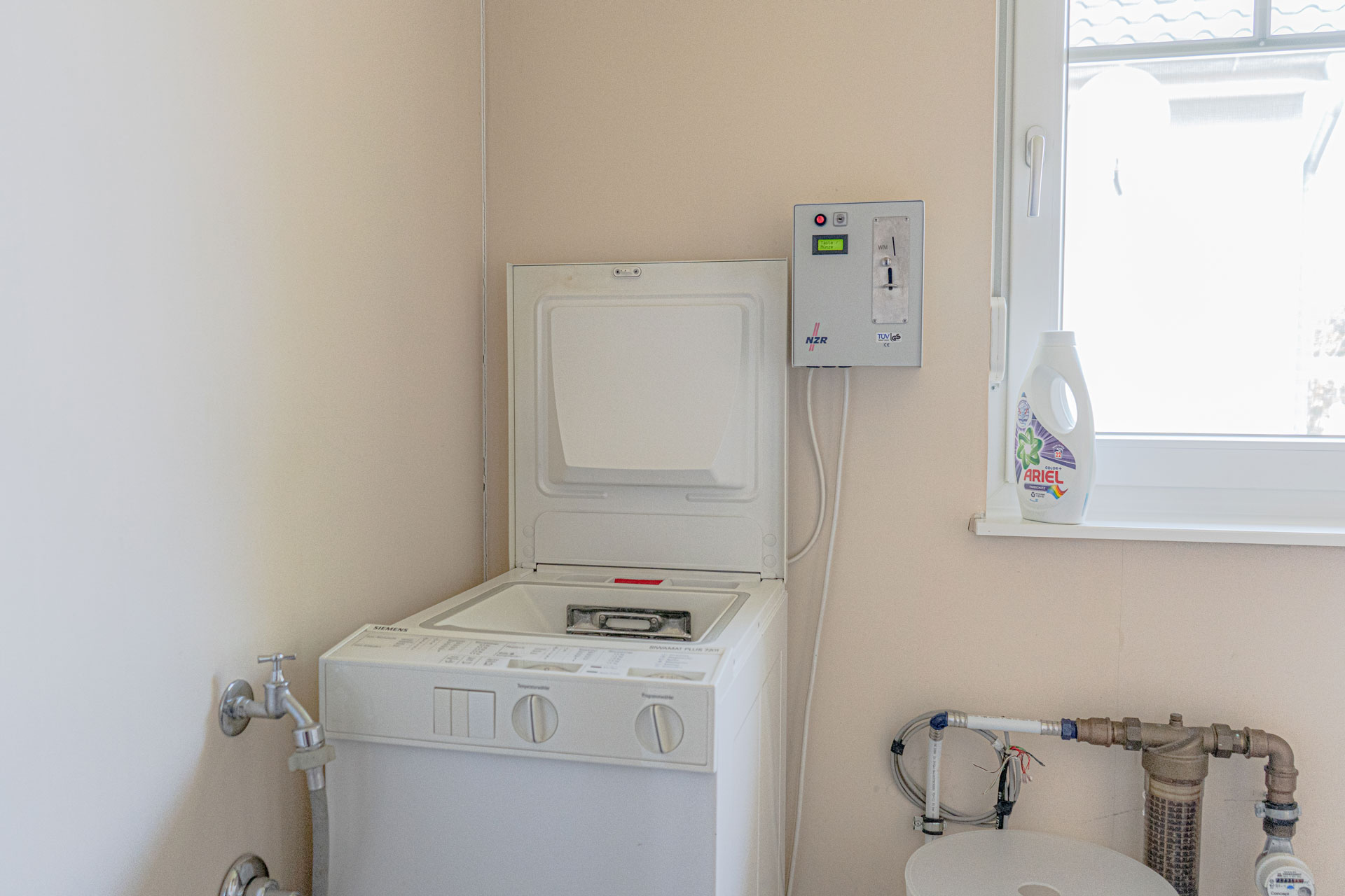 Hinzu gesellt sich im Erdgeschoss eine Waschmaschine sowie ein kleines Badezimmer mit Dusche und WC.