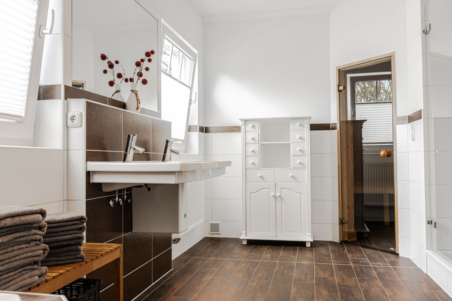 Im Obergeschoss stehen Ihnen drei Schlafzimmer und ein großes Badezimmer mit Badewanne und Sauna zur Verfügung.